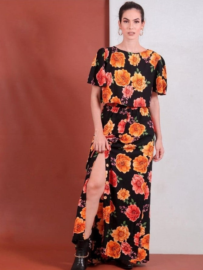 Floral Crop Top and Button Front Skirt Set