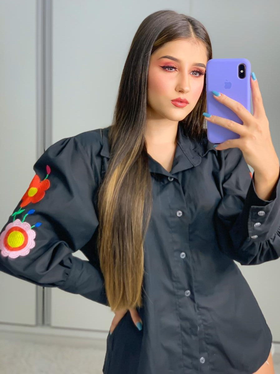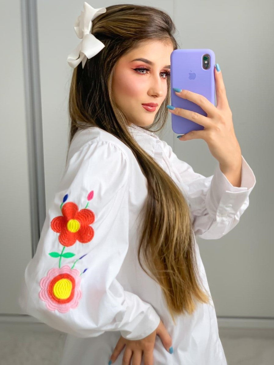 Puff Sleeve Floral Embroidery Button Front Shirt